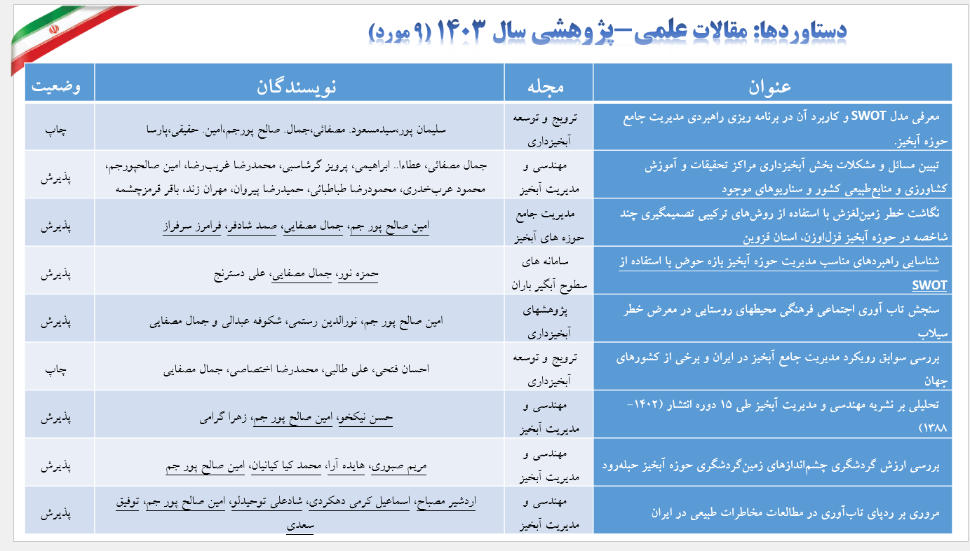 مقالات علمی پژوهشی سال ۱۴۰۳ ۳۰ تیر ۱۴۰۴ | ۰۸:۳۴ دستاوردهای گروه مدیریت حوزههای آبخیز تعداد بازدید:۳۹