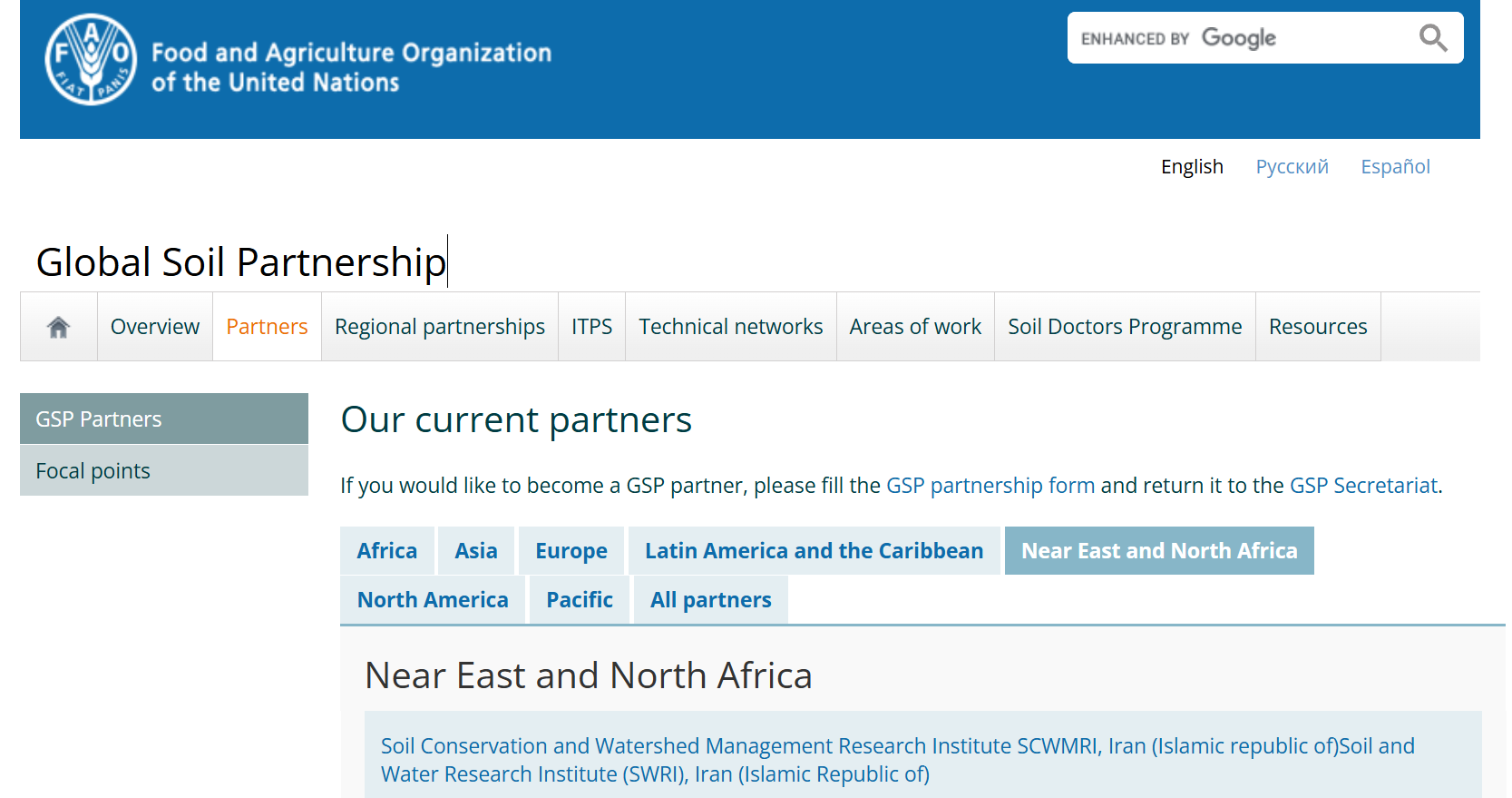 همکاریهای بین المللی تعداد بازدید:۱۴۱ عضویت رسمی در برنامه مشارکت جهانی خاک GSP سند دیپلماسی آب (به عنوان عضو کمیته تدوین وزارت امور خارجه) مشارکت در برنامه همکاری پژوهشی آبی با کشور عراق مشارکت در طرح تدوین تاب آوری حوضه ارس با کشور ترکیه